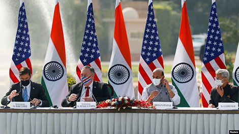 Ngày 27-10, Đối thoại 2+2 cấp bộ trưởng lần thứ ba giữa Ấn Độ và Mỹ đã mở ra tại New Delhi, với sự tham dự của Ngoại trưởng Mike Pompeo và Bộ trưởng Quốc phòng Mark Esper về phía Mỹ và hai đồng nhiệm Subrahmanyam Jaishankar, Rajnath Singh phía Ấn Độ. Kết thúc đối thoại 2+2, Ngoại trưởng Mỹ tuyên bố “sát cánh với New Delhi trước mọi mối đe dọa” và cam kết yểm trợ Ấn Độ tăng cường khả năng phòng thủ “bảo vệ chủ quyền”.