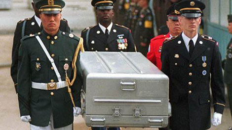Vệ binh danh dự của Liên Hiệp Quốc khiêng quan tài chứa hài cốt các binh sĩ Mỹ sau khi được Triều Tiên trao trả tại Bàn Môn Điếm ngày 14-5-1999.