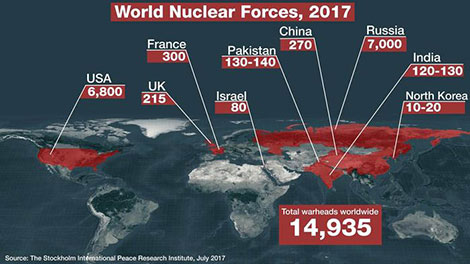 Những lo ngại trên đến từ thông báo do Viện Nghiên cứu hòa bình quốc tế Stockholm (SIPRI) đưa ra ngày 18/6. Các số liệu thống kê của SIPRI cho thấy tính đến thời điểm đầu năm 2018, 9 nước gồm Anh, Ấn Độ, Israel, Mỹ, Nga, Pháp, Pakistan, Triều Tiên, Trung Quốc có 14.456 đầu đạn hạt nhân, trong đó có 3.750 đầu đạn đã được triển khai.