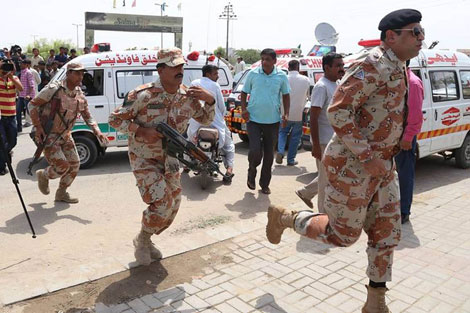 | Quân đội Pakistan bên ngoài một bệnh viện ở Karachi, nơi những người bị thương được điều trị. |