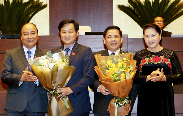 | Thủ tướng Chính phủ Nguyễn Xuân Phúc, Chủ tịch Quốc hội Nguyễn Thị Kim Ngân chúc mừng tân Tổng Thanh tra Chính phủ Lê Minh Khái và tân Bộ trưởng Bộ Giao thông Vận tải Nguyễn Văn Thể. Ảnh: TTXVN. |