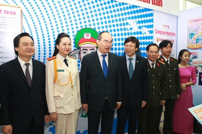 | Chủ tịch MTTQ Việt Nam Nguyễn Thiện Nhân thăm gian trưng bày của khối báo chí Công an |