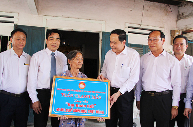 | Đồng chí Trần Thanh Mẫn trao tiền hỗ trợ xây nhà đại đoàn kết cho hộ nghèo tại thành phố Tam Kỳ, tỉnh Quảng Nam |