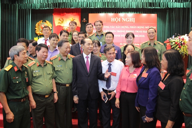 Thay mặt lãnh đạo Đảng, Nhà nước, Chủ tịch nước Trần Đại Quang biểu dương, chúc mừng những kết quả, thành tích xuất sắc trong phong trào Toàn dân bảo vệ ANTQ mà cấp uỷ Đảng, chính quyền, các ban, ngành, đoàn thể, thủ trưởng cơ quan, doanh nghiệp, nhà trường đã đạt được trong thời gian qua, nhiệt liệt chúc mừng các tập thể, cá nhân điển hình tiên tiến vinh dự được tôn vinh tại Hội nghị.