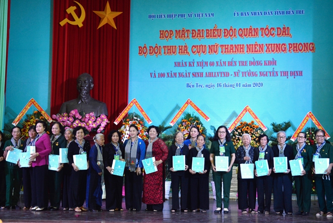 Chiều cùng ngày, Hội Liên hiệp Phụ nữ Việt Nam phối hợp với UBND tỉnh Bến Tre tổ chức họp mặt “Đội quân tóc dài”, Bộ đội Thu Hà, cựu nữ thanh niên xung phong nhân kỷ niệm 60 năm Ngày Bến Tre Đồng khởi, 100 năm Ngày sinh Anh hùng Lực lượng vũ trang nhân dân - Nữ tướng Nguyễn Thị Định.