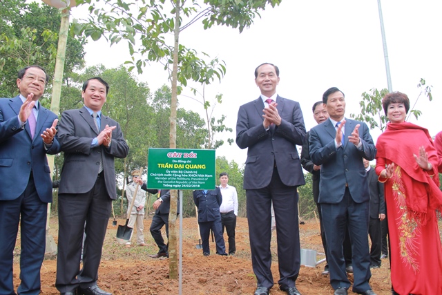 | Chủ tịch nước Trần Đại Quang trồng cây lưu niệm trong khuôn viên làng dân tộc Mường. |