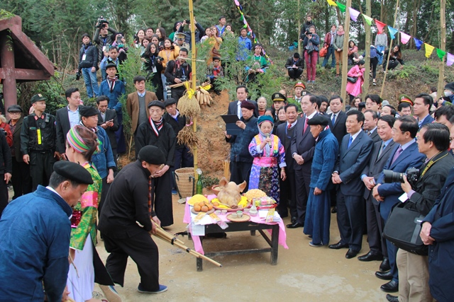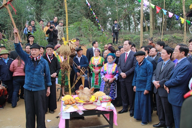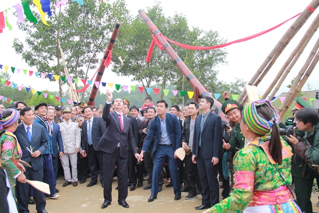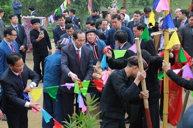 | Chủ tịch nước Trần Đại Quang cùng tham dự nghi thức dựng cây Nêu ngày Tết của đồng bào dân tộc Mông. |