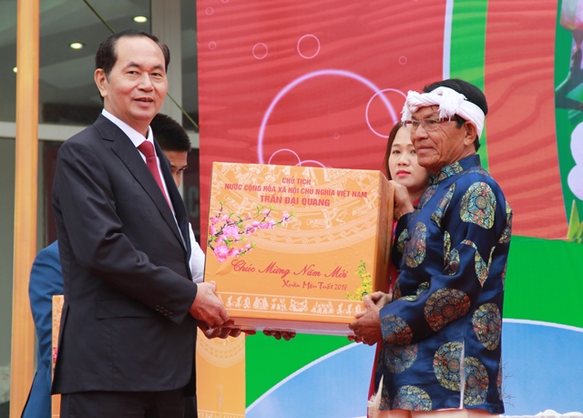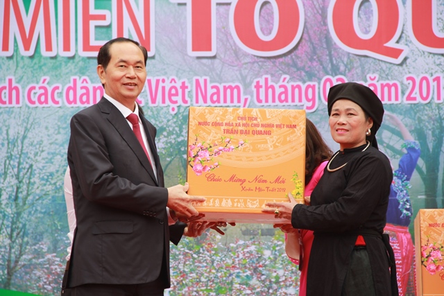 | Chủ tịch nước Trần Đại Quang tặng quà cho đồng bào các dân tộc. |