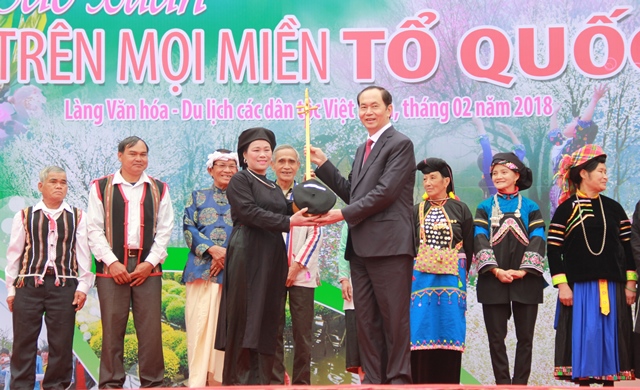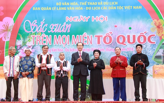 “Đặc biệt là Ngày hội “Sắc Xuân trên mọi miền Tổ quốc” qua các năm tổ chức đã đón trên hàng chục nghìn lượt đồng bào các dân tộc tham gia hơn 50 lễ hội, hoạt động. Đây là điểm hội tụ, lan tỏa truyền thống văn hóa, nhất là vào dịp Tết cổ truyền của dân tộc. Tôi đánh giá cao những cố gắng nỗ lực của Bộ Văn hóa, Thể thao và Du lịch, Ban Quản lý Làng Văn hóa Du lịch các dân tộc Việt Nam và đồng bào các dân tộc hoạt động tại Làng” - Chủ tịch nước Trần Đại Quang khẳng định.