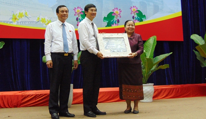 | Lãnh đạo tỉnh Quảng Nam tặng quà lưu niệm cho lãnh đạo Đoàn nữ đại biểu Quốc hội Việt Nam-Lào. |