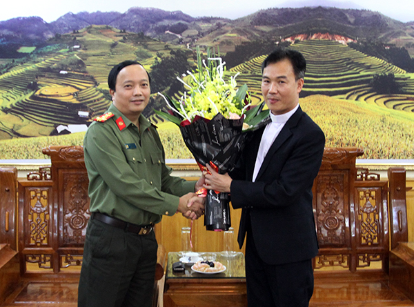 | Đại diện đồ Công giáo, Phật giáo trên địa bàn tỉnh đã đến thăm và tặng hoa chúc mừng Đại tá Đặng Hồng Đức, Giám đốc Công an tỉnh Yên Bái vừa được bầu vào Ủy viên Ban Thường vụ Tỉnh ủy, nhiệm kỳ 2020-2025. |