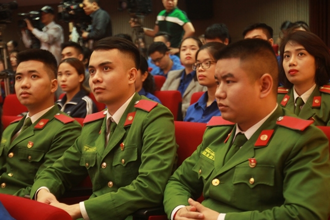 | Các ĐVTN Công an tiêu biểu tham dự buổi đối thoại trực tuyến với Bí thư thứ Nhất TƯ Đoàn Lê Quốc Phong tại điểm cầu Hà Nội |