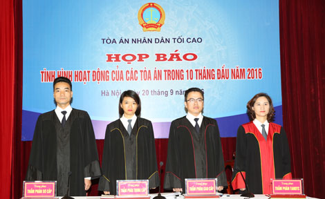 Sáng 20-9, tại Hà Nội, TAND tối cao tổ chức họp báo thông báo tình hình hoạt động của các Tòa án trong 10 tháng đầu năm 2016. Đồng chí Nguyễn Sơn, Phó Chánh án chủ trì buổi họp.