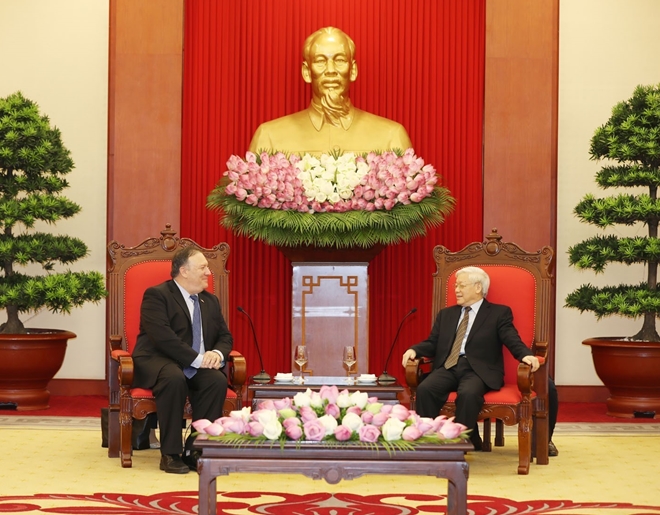Tổng Bí thư Nguyễn Phú Trọng hoan nghênh và đánh giá cao ý nghĩa chuyến thăm Việt Nam của Ngoại trưởng Mike Pompeo trong bối cảnh hai nước đang có những bước phát triển tốt đẹp trong quan hệ hợp tác nhiều mặt thời gian qua.
