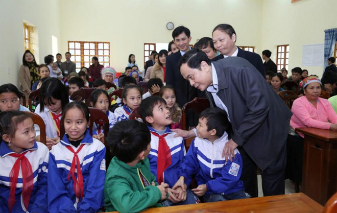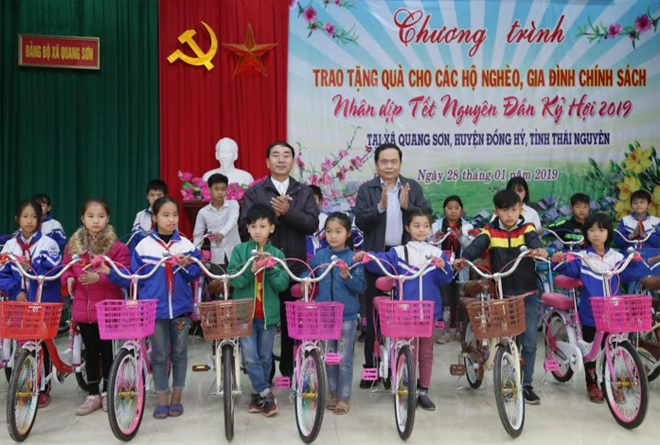 | Chủ tịch Trần Thanh Mẫn trao xe đạp tặng các cháu học sinh nghèo trên địa bàn xã Quang Sơn, huyện Đồng Hỷ. |