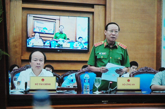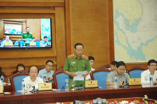 | Thứ trưởng Bộ Công an Lê Quý Vương báo cáo một số mặt công tác Công an về môi trường tại hội nghị trực tuyến. |