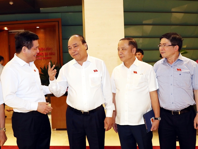 | Thủ tướng Nguyễn Xuân Phúc trao đổi với các đại biểu Quốc hội. Ảnh: TTXVN |