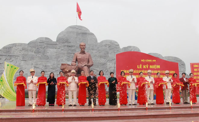 | Chủ tịch Quốc hội Nguyễn Thị Kim Ngân; Thượng tướng Tô Lâm, Bộ trưởng Bộ Công an cùng các đại biểu cắt băng khánh thành Khu lưu niệm Sáu điều Bác Hồ dạy CAND. |