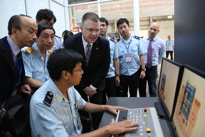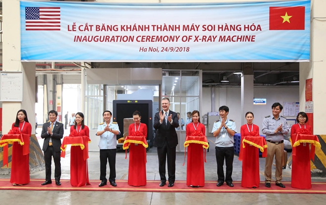 Sáng 24-9, tại Kho dịch vụ hàng hóa Nội Bài, Cảng hàng không quốc tế Nội Bài, Đại sứ Mỹ tại Việt Nam Daniel Kritenbrink đã đại diện phía Mỹ bàn giao một máy soi hàng hóa hiện đại do Chính phủ Mỹ tài trợ cho lực lượng Hải quan Việt Nam.