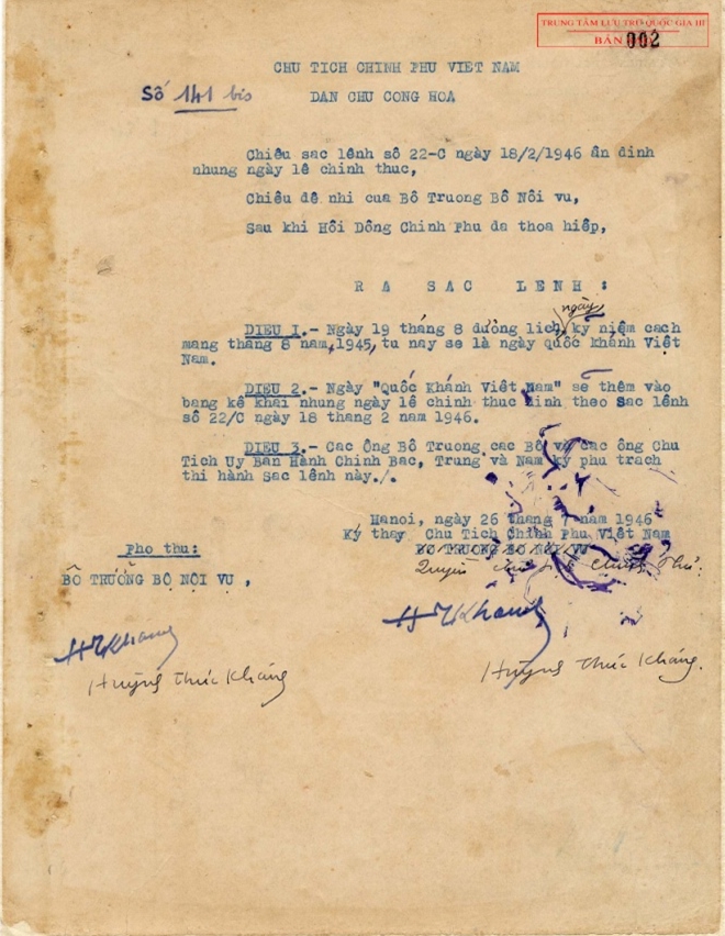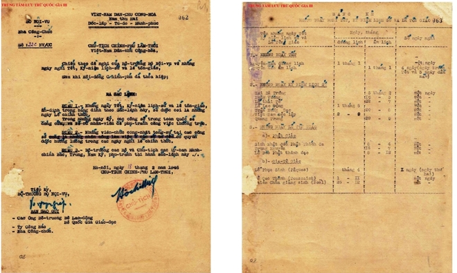 Cụ thể là Sắc lệnh 22C NV/CC ngày 18-2-1946 do Chủ tịch Hồ Chí Minh ký, quy định những ngày Tết, kỷ niệm lịch sử và lễ tôn giáo, trong đó có ấn định ngày 2-9 là ngày Việt Nam độc lập.