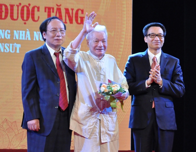 | Phó Thủ tướng Vũ Đức Đam và NSND Lê Tiến Thọ tặng hoa chúc mừng NSND Trần Bảng. |
