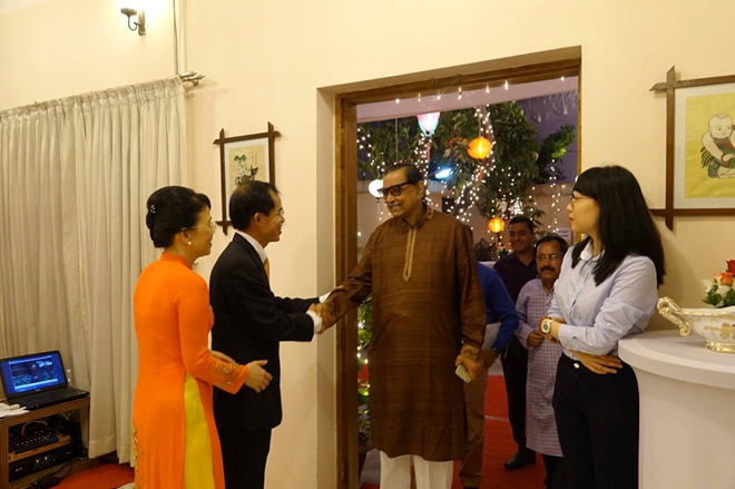 | Đại sứ Trần Văn Khoa và phu nhân đón tiếp Bộ trưởng Hàng không dân dụng và Du lịch Bangladesh tới dự tiệc chiêu đãi nhân kỷ niệm Quốc khánh Việt Nam. Ảnh: Facebook/Tran Bao Son. |