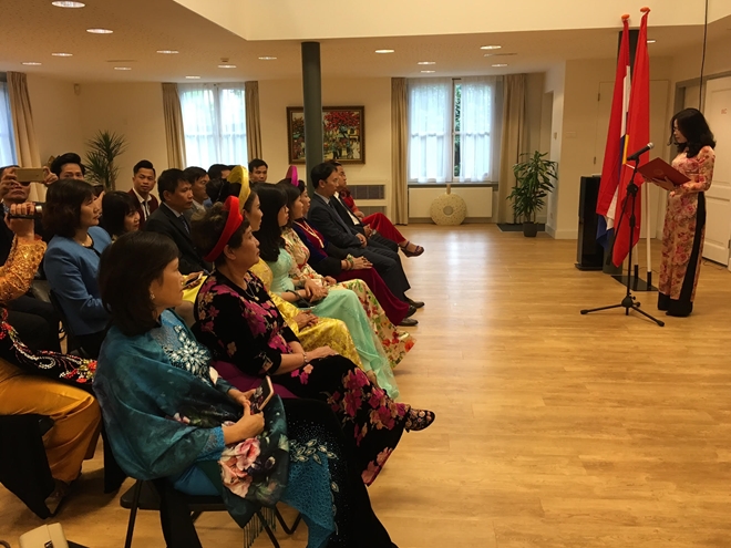 | Các đại biểu cùng cộng đồng người Việt tại Hà Lan trong tà áo dài truyền thống. |