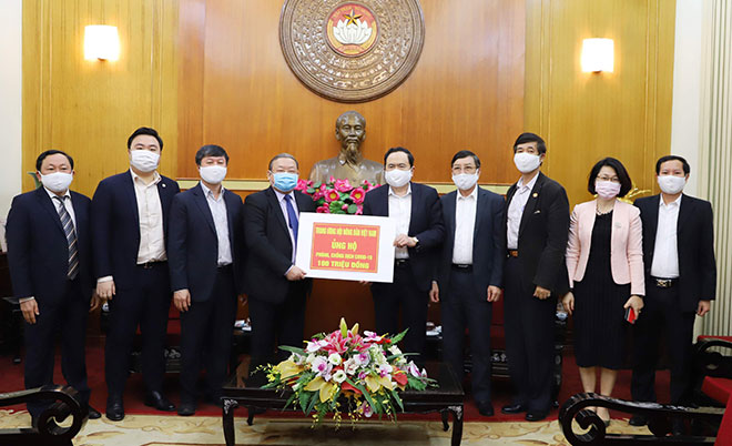 | Đồng chí Trần Thanh Mẫn tiếp nhận ủng hộ từ Trung ương Hội Nông dân Việt Nam. |