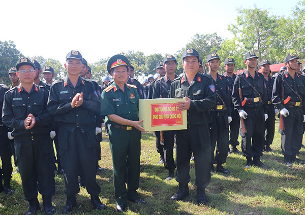 | Phó Chủ tịch Quốc hội Đỗ Bá Tỵ tặng quà lưu niệm CBCS Trung đoàn CSCĐ Tây Nam Bộ. |