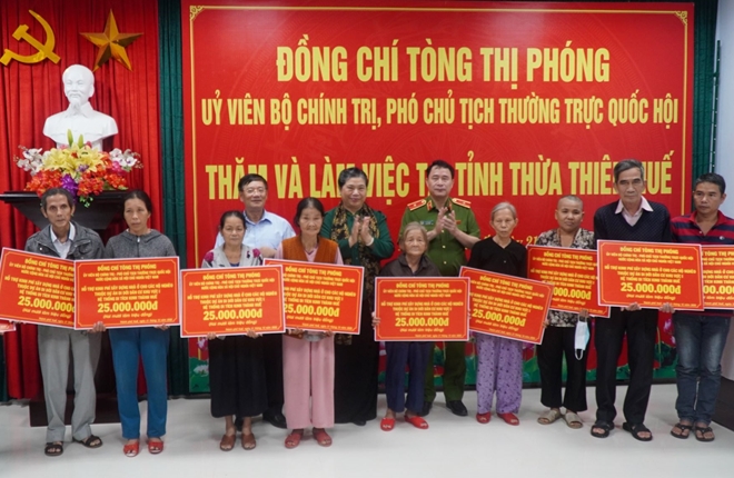 Trước đó, chiều tối 21/10, tại phường Hương Sơ, TP Huế, Phó Chủ tịch Thường trực Quốc hội Tòng Thị Phóng đã đến thăm và trao quà cho các hộ nghèo thuộc thuộc dự án di dân tái định khu vực I Kinh thành Huế. Phó Chủ tịch Thường trực Quốc hội cho biết, qua sự vận động, quyên góp của Tổ công tác và Thiếu tướng Lê Quốc Hùng, Thứ trưởng Bộ Công an, 20 hộ nghèo tại khu tái định cư Hương Sơ thuộc dự di di dân tái định cư khu vực I Kinh thành Huế được nhận những phần quà và số tiền 25 triệu đồng/1 hộ.