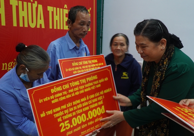 Phó Chủ tịch Thường trực Quốc hội Tòng Thị Phóng trao quà các hộ nghèo thuộc thuộc dự án di dân tái định khu vực I Kinh thành Huế. |