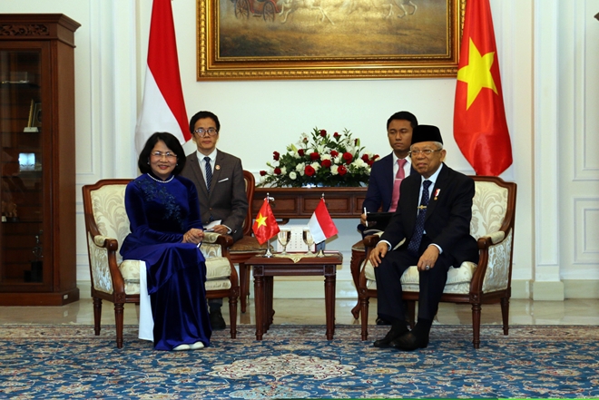 | Phó Chủ tịch nước Đặng Thị Ngọc Thịnh và Phó Tổng thống Indonesia Ma'ruf Amin. |