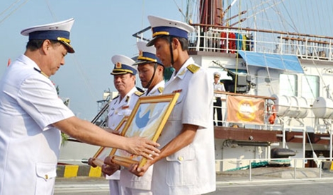 | Chính ủy Quân chủng hải quân trao quốc kỳ và quân kỳ cho sĩ quan, thủy thủ tàu buồm 286-Lê Quý Đôn. |