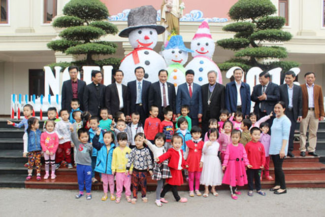 | Thứ trưởng Bùi Văn Nam cùng đoàn công tác với các cháu thiếu nhi tại trường dòng mến thánh giá giáo phận Thanh Hóa. |