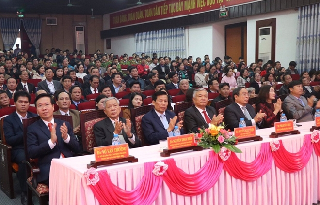 Đồng chí Võ Văn Thưởng, Ủy viên Bộ Chính trị, Bí thư Trung ương Đảng, Trưởng Ban Tuyên giáo Trung ương (hàng đầu, góc trái) cùng các đại biểu dự lễ kỷ niệm. |