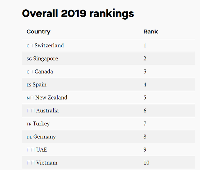 | Bảng xếp hạng top 10 quốc gia đáng sống và làm việc nhất với người nước ngoài năm 2019. Nguồn: HSBC’s Expat 2019 Global Report |
