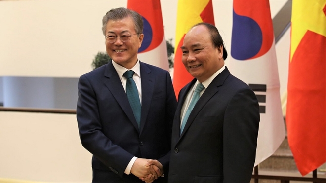 Đánh giá cao sự tiến triển mạnh mẽ của mối quan hệ Việt Nam-Hàn Quốc nhất là trong các lĩnh vực thương mại, đầu tư, văn hóa, Tổng thống Moon Jae-in nhấn mạnh Hàn Quốc coi Việt Nam là nước quan trọng nhất trong chính sách hướng Nam mới.