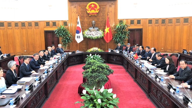 Bày tỏ vui mừng trước những thành tựu hợp tác giữa hai nước thời gian qua trên mọi lĩnh vực, Thủ tướng Nguyễn Xuân Phúc đánh giá cao sự đóng góp của các Tập đoàn lớn của Hàn Quốc đối với tiến trình phát triển của Việt Nam như Samsung, LG, Lotte...