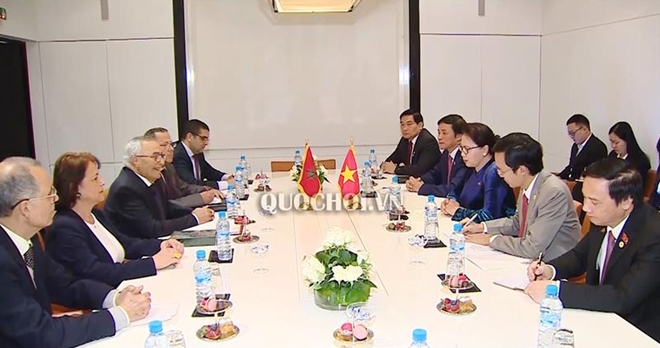 Chủ tịch Quốc hội bày tỏ cảm ơn sự phối hợp, ủng hộ của Morocco dành cho Việt Nam tại cơ chế hợp tác đa phương; cho rằng để rút ngắn khoảng cách địa lý, hai bên cần tích cực đẩy mạnh hợp tác chặt chẽ, hiệu quả hơn nữa.