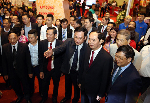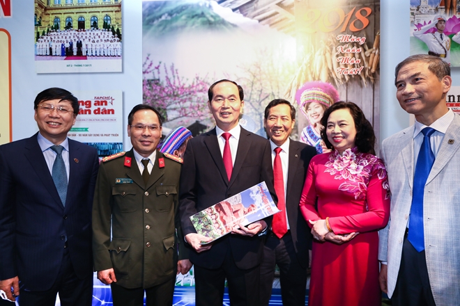 Chủ tịch nước Trần Đại Quang tham quan các gian trưng bày tại Hội báo (3/2018). |