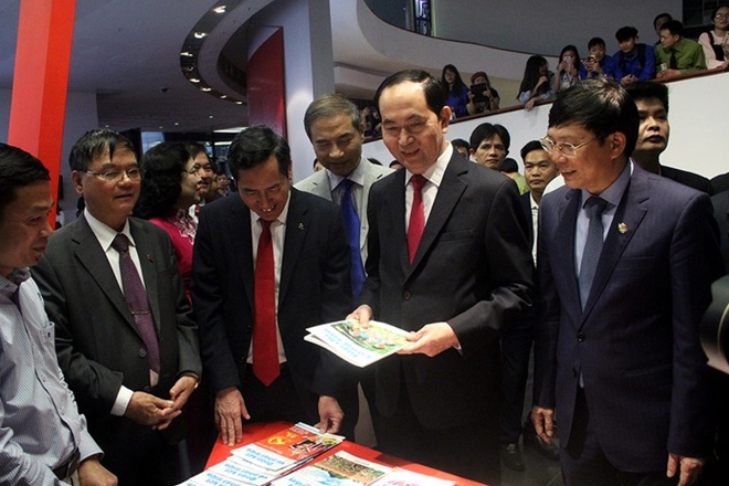 Chủ tịch nước Trần Đại Quang tham quan các gian trưng bày tại Hội báo (3/2018). |