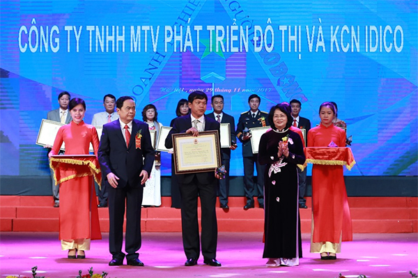 | Phó Chủ tịch nước Đặng Thị Ngọc Thịnh và Chủ tịch UBMTTQ Việt Nam Trần Thanh Mẫn trao bằng khen cho các doanh nghiệp tiêu biểu |