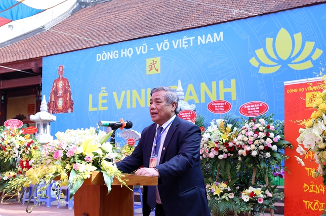 Phát biểu khai mạc buổi lễ, thay mặt Hội đồng Dòng họ Vũ - Võ Việt Nam, GS.TSKH, Nhà giáo nhân dân Vũ Minh Giang nêu rõ: “Dòng họ Vũ - Võ Việt Nam là một họ lớn trong cộng đồng các dòng họ tại Việt Nam, với số con em trong dòng họ gần 4 triệu người. Tổ chức HĐDH hiện nay được hình thành trên 40 tỉnh, thành phố và nhiều nước trên thế giới. Hướng về những giá trị cốt lõi của Dòng họ, đề cao lòng nhân ái, đề cao giá trị trí tuệ, trong thời gian qua, con em Dòng họ đã có nhiều thành tựu trong công việc, hoạt động, cũng như đem các giá trị cốt lõi của Dòng họ để các cá nhân phát huy trên các cương vị công tác của mình.