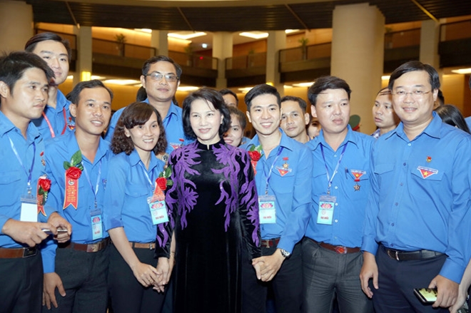 | Chủ tịch Quốc hội Nguyễn Thị Kim Ngân và Bí thư thứ nhất T.Ư Đoàn Lê Quốc Phong (bìa phải) gặp gỡ thanh niên tiên tiến. Ảnh: Thanh niên |