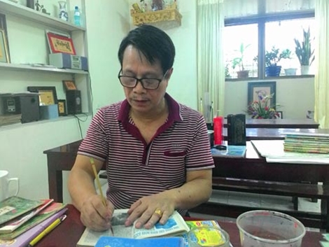 Tôi tìm đến nhà giữa lúc ông đang say sưa đưa tay chỉ lối, luyện chữ cho các trò. Buổi học diễn ra khá tĩnh mịch với khoảng hai mươi trò đang cặm cụi viết chữ. Bên cạnh những trò nhỏ tuổi thuộc bậc tiểu học, trung học thì có cả những học sinh phổ thông, đại học đến xin luyện viết chữ đẹp.