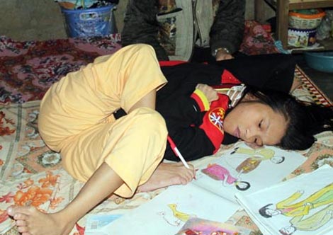 Nhìn em quằn mình trên nền nhà, xoay đủ mọi kiểu nằm để kéo những nét vẽ thành hình, rồi đưa bàn chân hất, lựa chọn màu tô tranh cho phù hợp. Tôi càng khâm phục ý chí và nghị lực của em. Nghị lực của Thảnh, ước mơ của Thảnh, cũng chính là niềm an ủi, động viên tinh thần thêm cho mẹ em mỗi ngày. “Em sẽ cố gắng vẽ thật nhiều tranh rồi đem bán để lấy tiền sửa nhà, mua thuốc cho mẹ, rồi cho em nữa”, Thảnh nói rất hồn nhiên, ngô ngê nhưng đó lại là cả một ước mơ của em. Tôi nghe em nói mà lặng người không hiểu vì sao một cô bé tật nguyền lại có suy nghĩ sâu xa đến như vậy? Khi mà hai mươi bốn năm qua, khoảng không gian mà em biết và tiếp xúc chỉ là nền nhà, mẹ và bút chì, sáp màu. Một điều ở em làm tôi ngạc nhiên hơn nữa, là Thảnh chưa qua học một trường lớp nào, vậy mà em đã tự viết được tên của mình, tên của mẹ, rồi em tự tô màu cho những nét chữ đó.