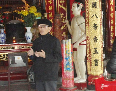 | Thầy giáo Nguyễn Đức Thìn hướng dẫn du khách tham quan, tìm hiểu lịch sử Đền Đô và vương triều nhà Lý. |
