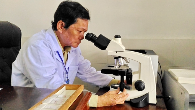 | BS Hồ Viết Thọ giám định mẫu bệnh phẩm trên thiết bị chuyên dụng. |