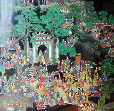 Ông giải thích thêm cho tôi biết về nguyên tắc, tranh sơn khắc là tranh tả nét, thể hiện trên tấm vóc sơn mài đã được đánh bóng. Hình khắc chìm với độ sâu bằng nhau rồi được tô mầu làm nổi bật hình tượng của bức tranh. Nói rồi ông dẫn tôi ra xem một bức tranh khổ lớn “Hội làng”, của một khách đặt hàng. Đúng là một không khí của một lễ hội phủ khắp bốn góc bức hình và phủ đầy một cảm xúc trong màu sắc, dạt dào và thành kính.