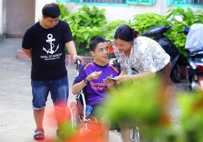 Tiếp đến, cô bế cậu bé bại liệt xuống xe lăn, rồi vừa thở vừa cặm cụi đẩy chiếc xe lăn đưa cậu bé đi đánh răng, rồng rắn theo sau là mấy đứa nhỏ còn lại: đứa thì bu chân, đứa thì níu áo cô... Đúng 7 giờ sáng, buổi học của những đứa trẻ khuyết tật bắt đầu.